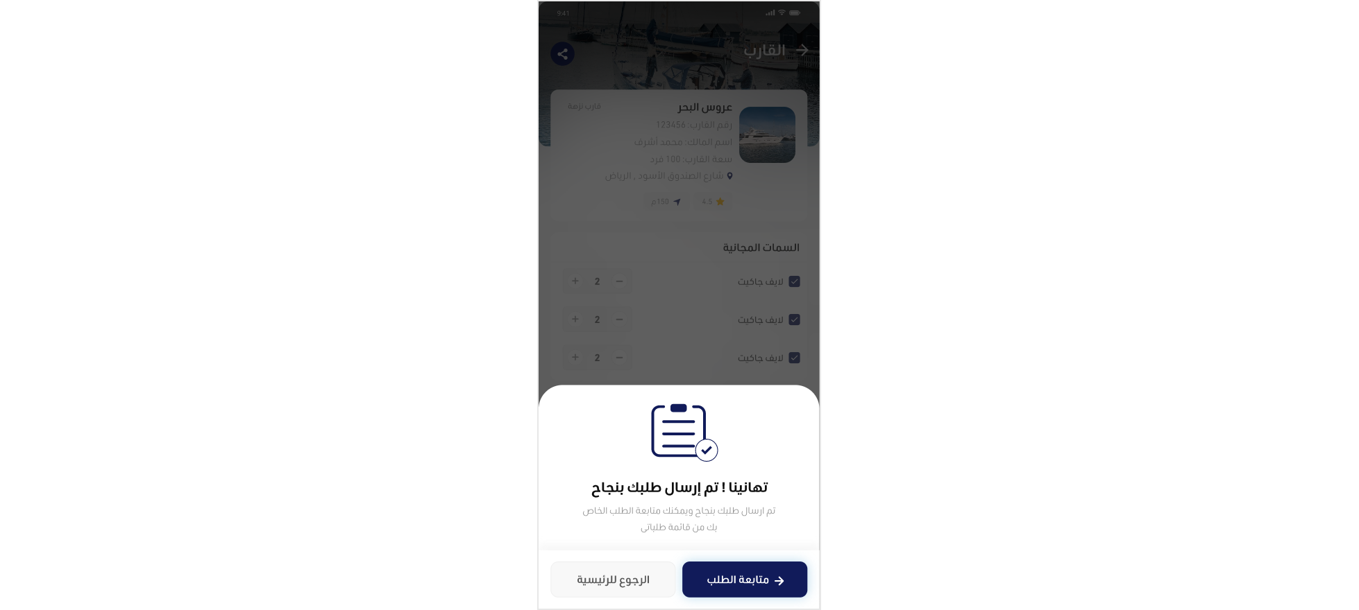قم باختيار القارب وادخال كافة بيانات رحلتك واضغط على تأكيد لارسال الطلب